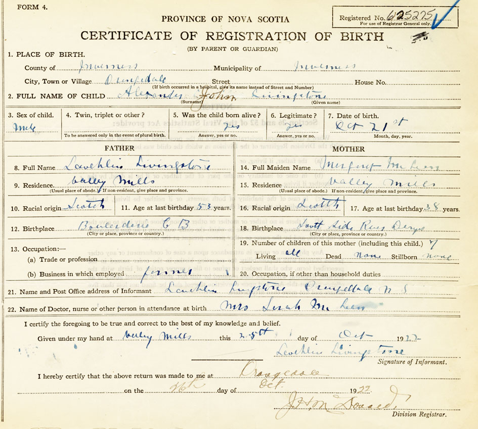 21. Name and Post Office address of Informant Lauchlin Livingstone Orangedale