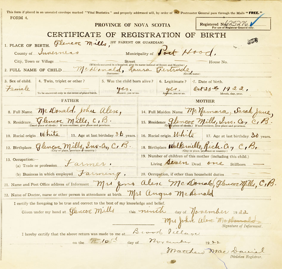 21. Name and Post Office address of Informant Mrs John Alex McDonald Glencoe Mills, CB