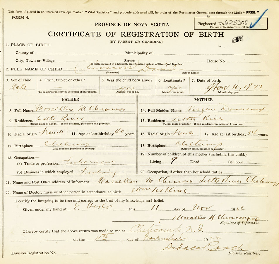 21. Name and Post Office address of Informant Marcellin M Chiasson Little River, Cheticamp