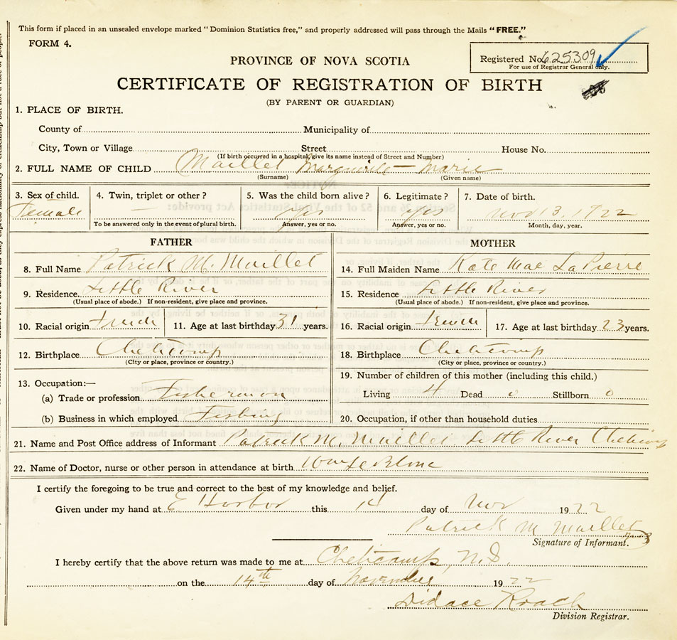 21. Name and Post Office address of Informant Patrick M Maillet Little River, Cheticamp