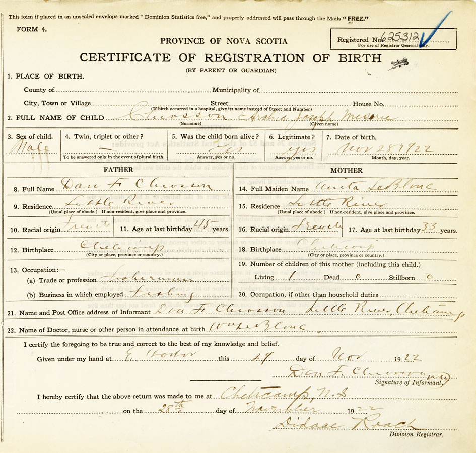 21. Name and Post Office address of Informant Dan F Chiasson Little River, Cheticamp