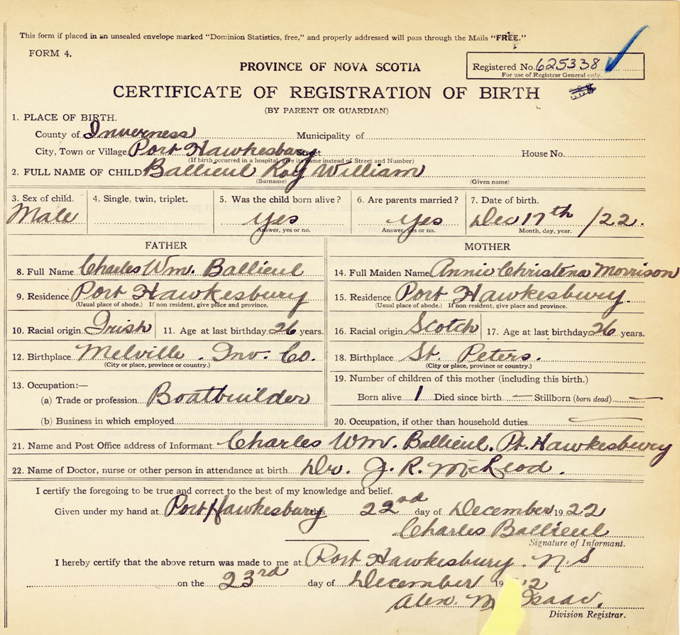 21. Name and Post Office address of Informant Charles Ballieul Port Hawkesbury