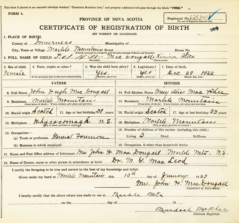22. Name of Doctor, nurse or other person in attendance at birth Dr. M G MacLeod