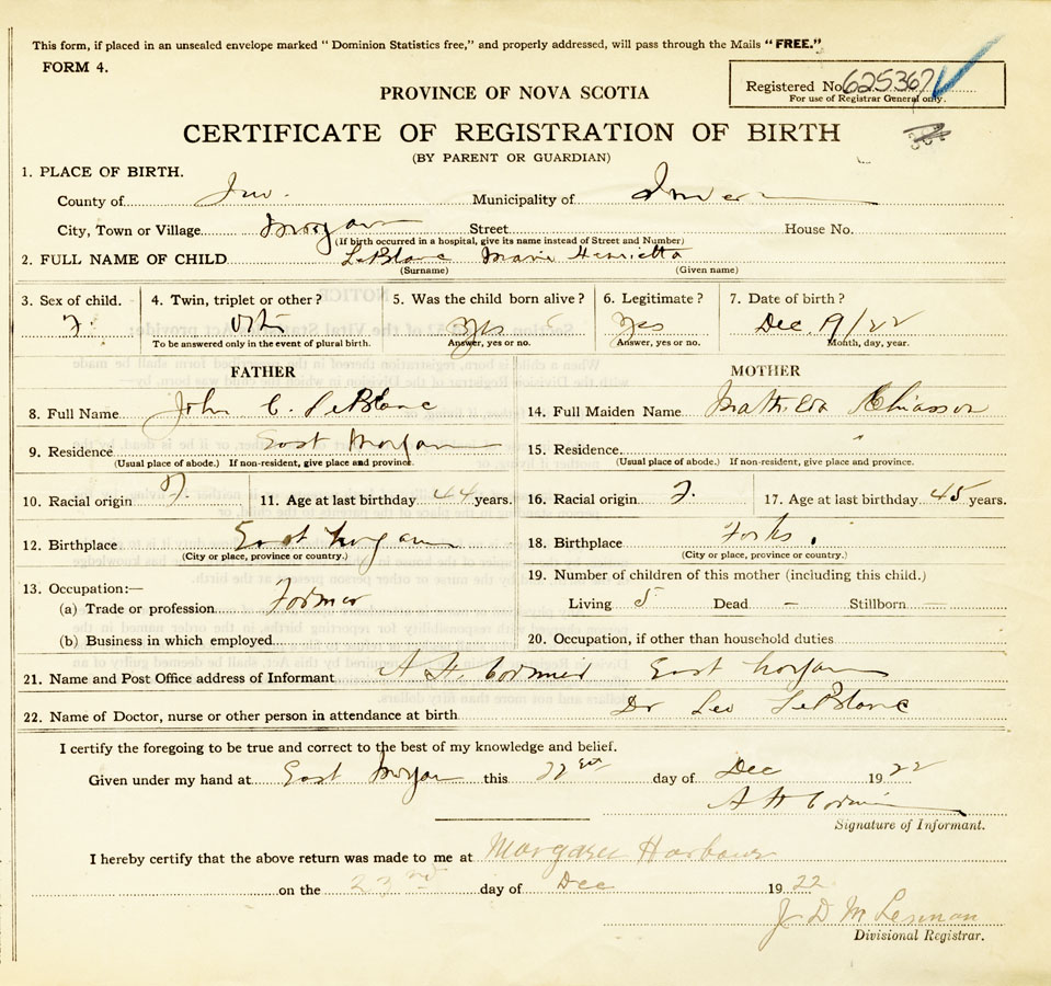 22. Name of Doctor, nurse or other person in attendance at birth Dr. Leo LeBlanc
