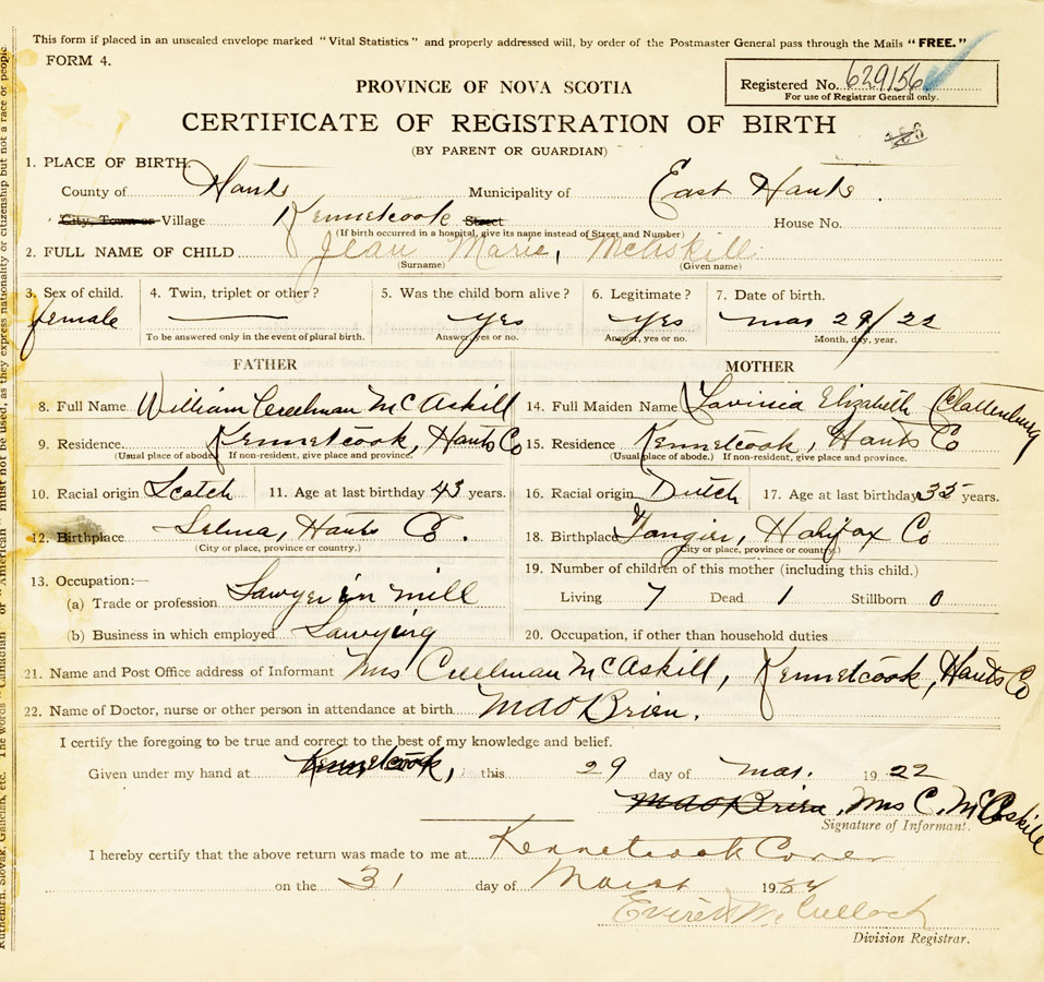21. Name and Post Office address of Informant Mrs. Creelman McAskill Kennetcook, Hants