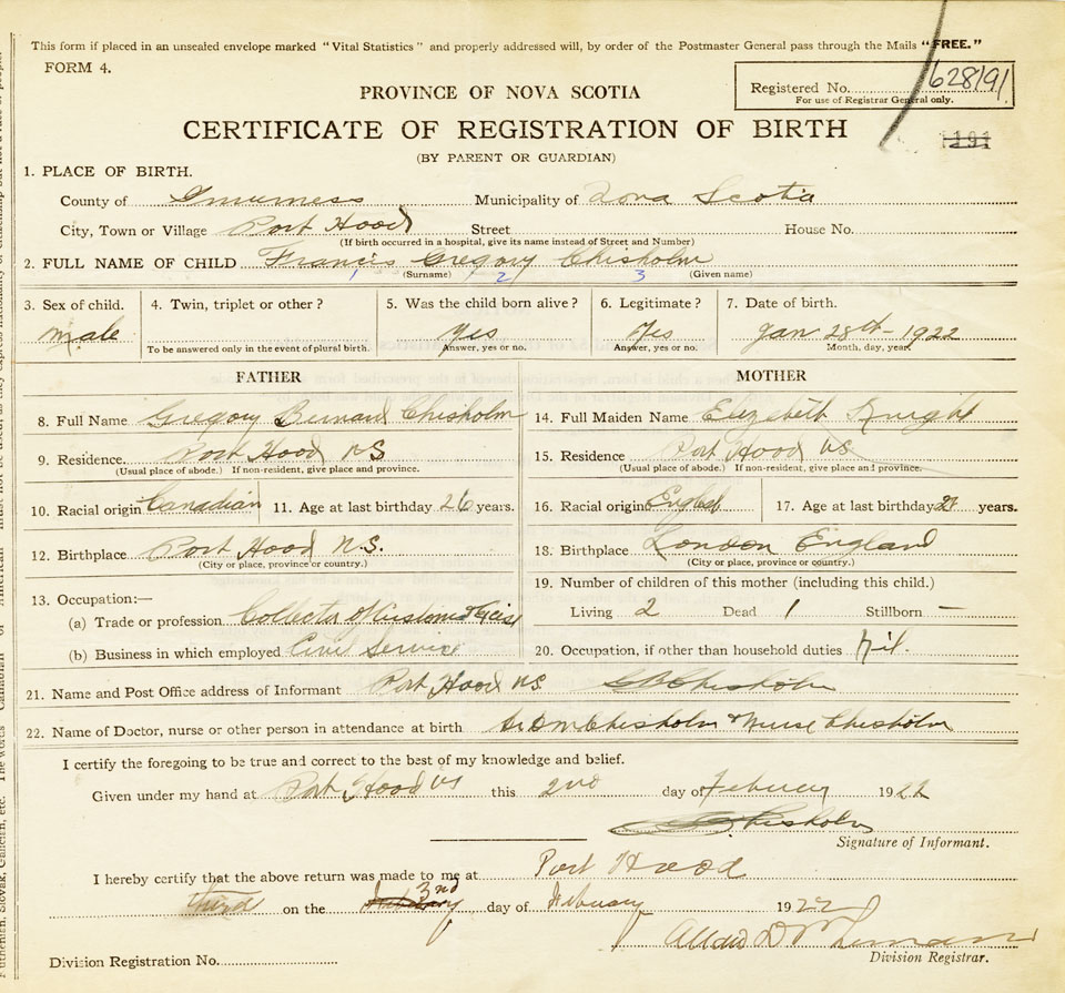 22. Name of Doctor, nurse or other person in attendance at birth Dr. D M Chisholm, Nurse Chisholm