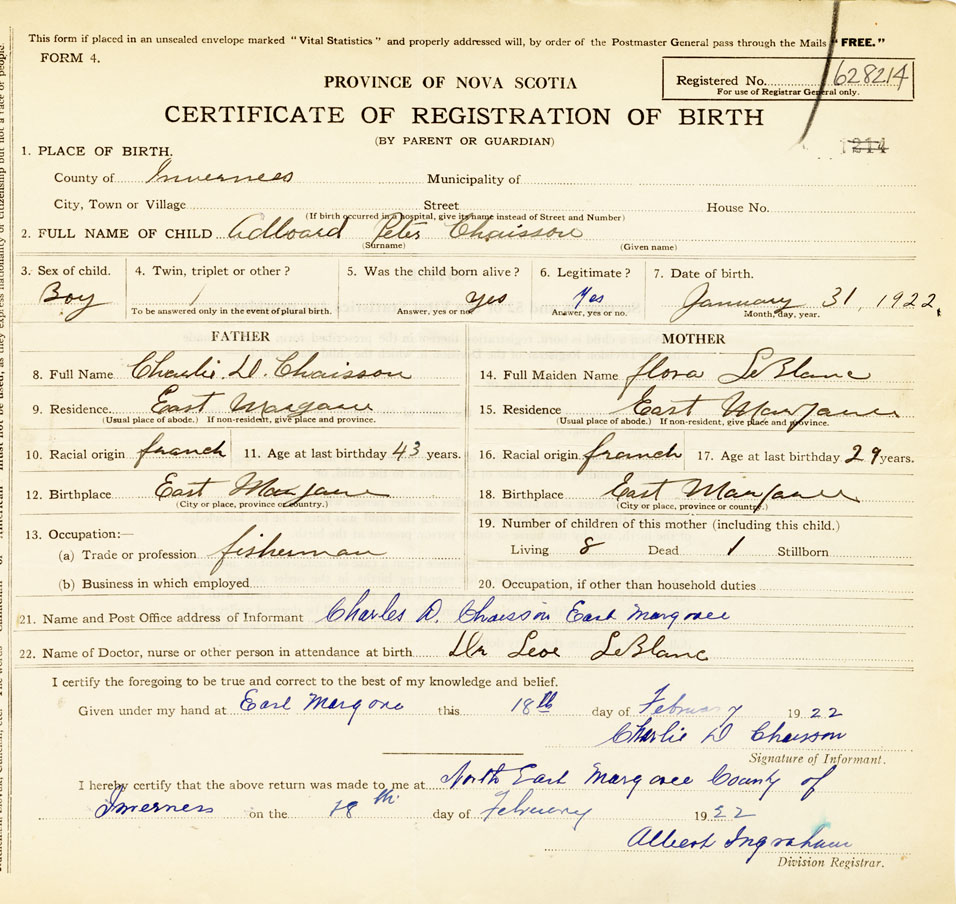 21. Name and Post Office address of Informant Charlie D Chiasson East Margaree