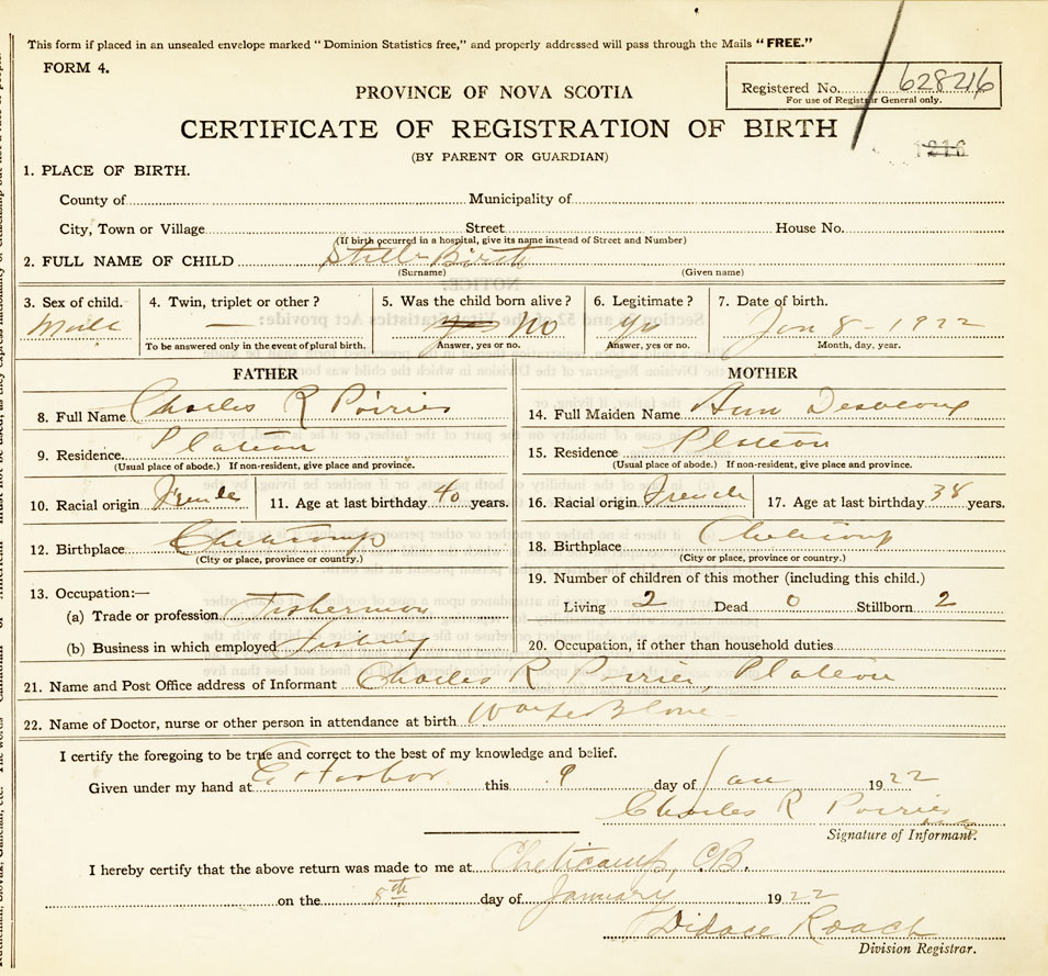 22. Name of Doctor, nurse or other person in attendance at birth Wm. LeBlanc