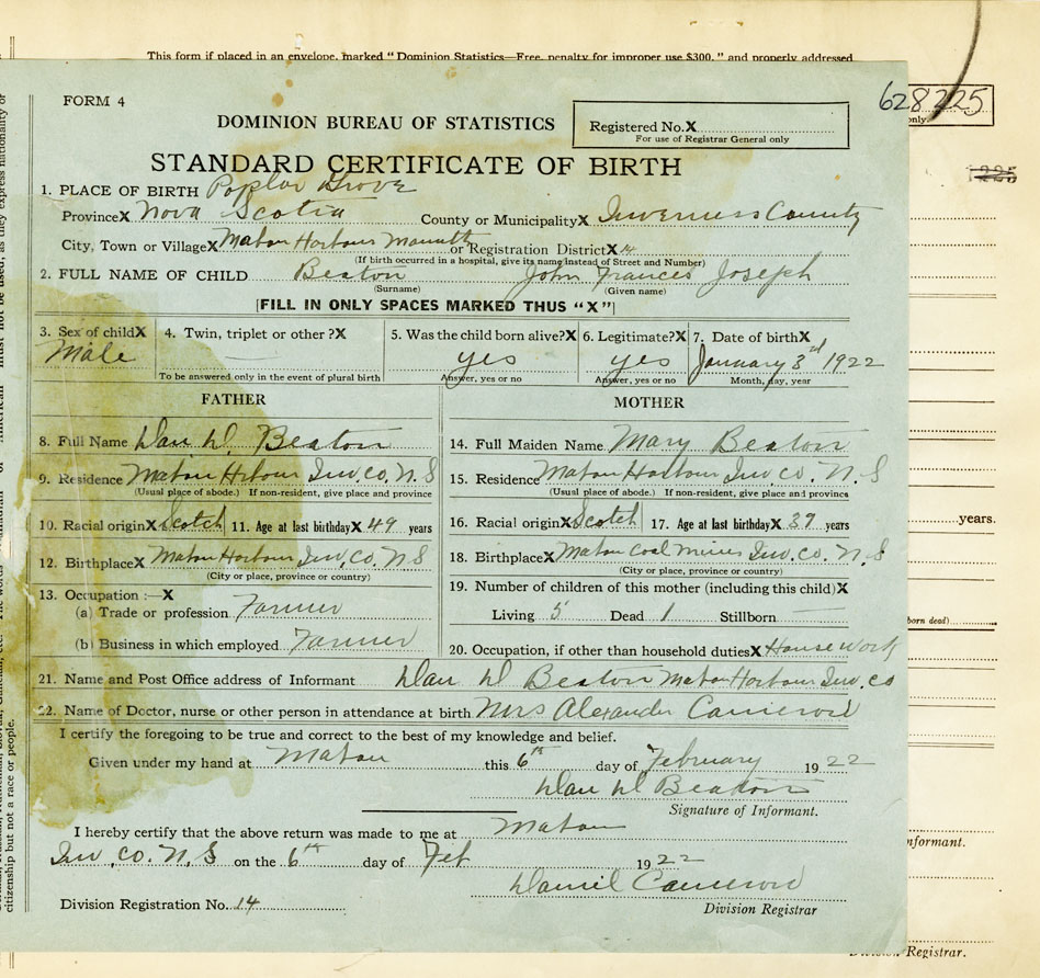 21. Name and Post Office address of Informant Don D Beaton Mabou Harbour, Inv.
