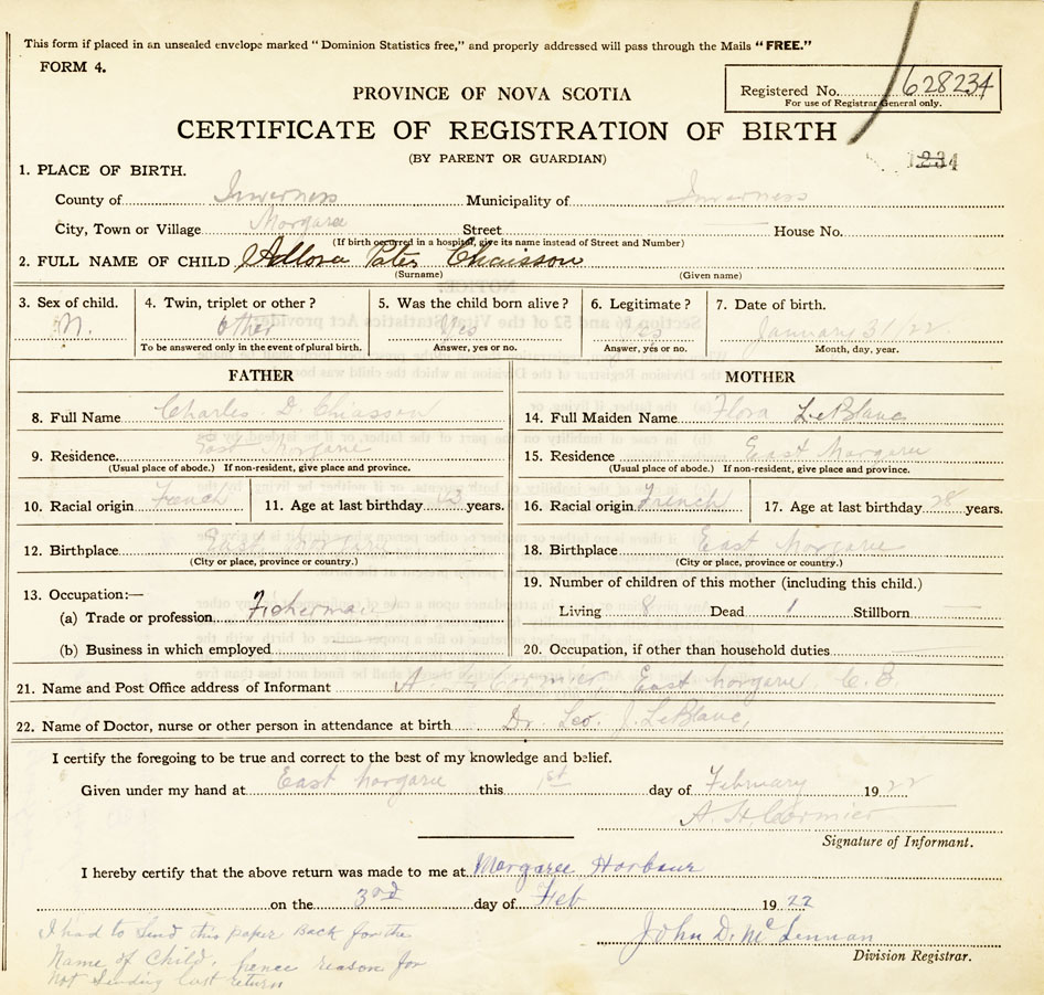 22. Name of Doctor, nurse or other person in attendance at birth Dr. Leo. J. LeBlanc