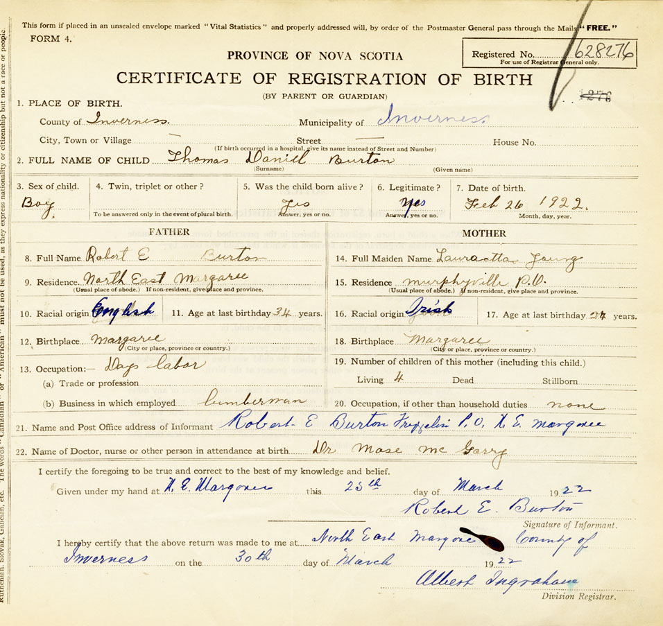 21. Name and Post Office address of Informant Robert E. Burton Frizzleton P.O. N.E.Margaree