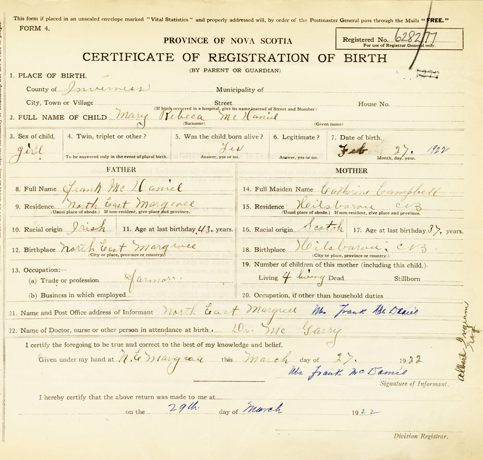 21. Name and Post Office address of Informant Mrs. Frank McDaniel North East Margaree