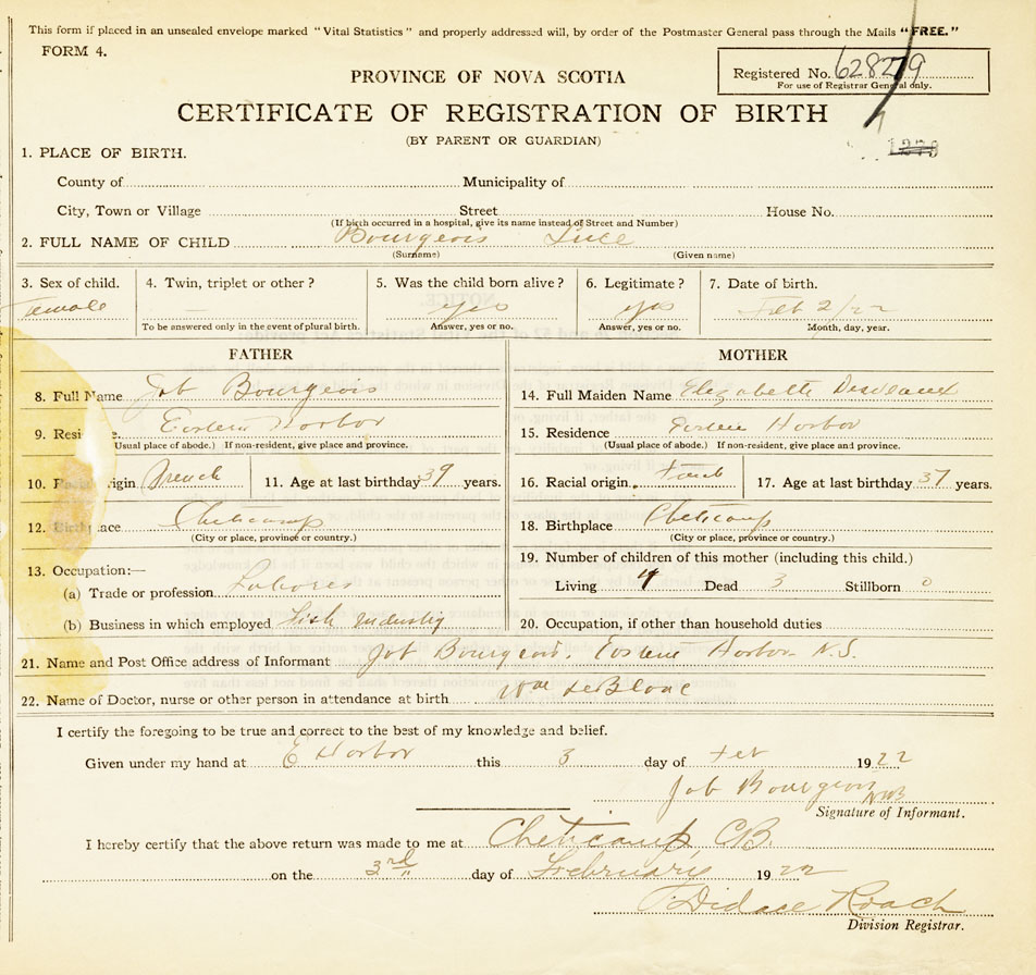 21. Name and Post Office address of Informant Job Bourgeois E.Harbor