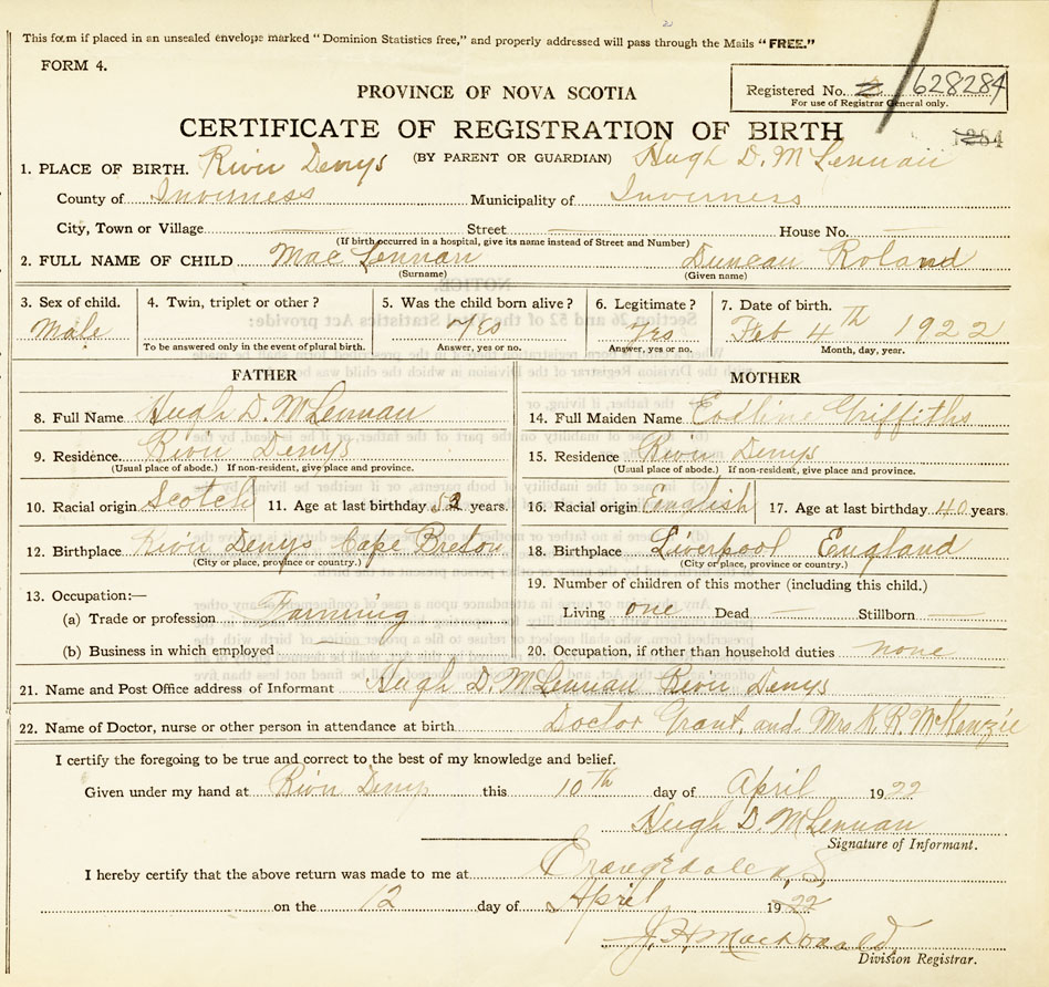 2. FULL NAME OF CHILD MacLennan, Duncan Roland