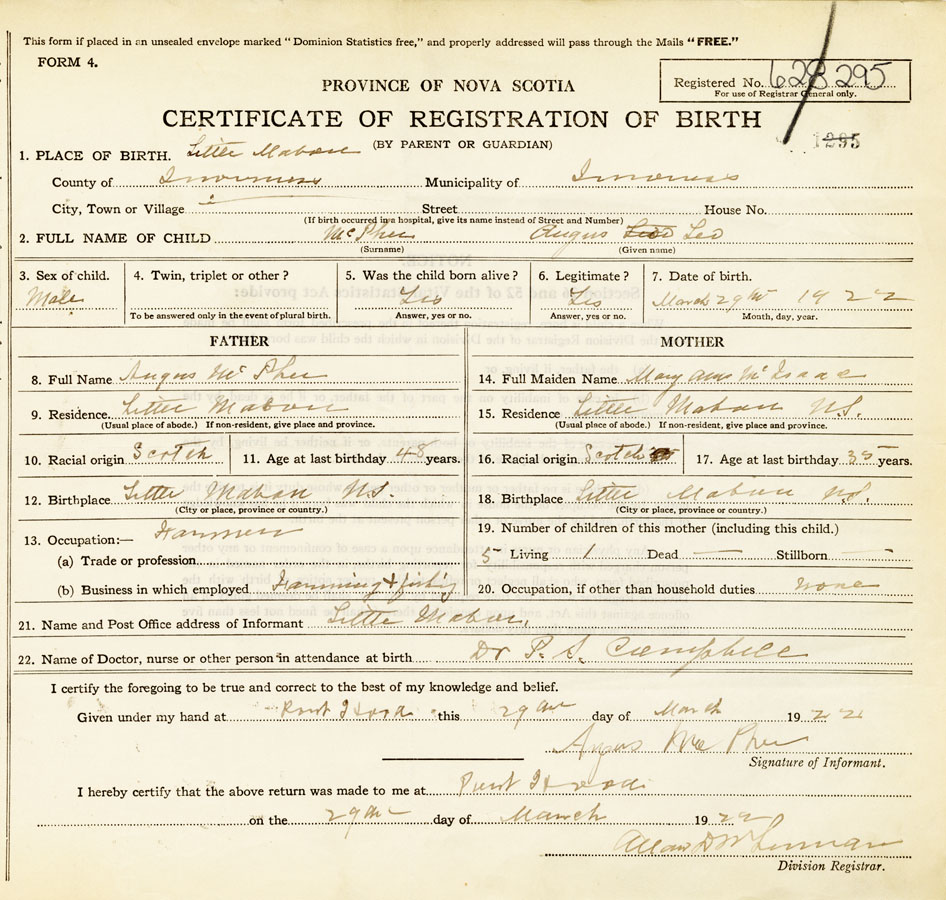 21. Name and Post Office address of Informant Angus McPhee Little Mabou