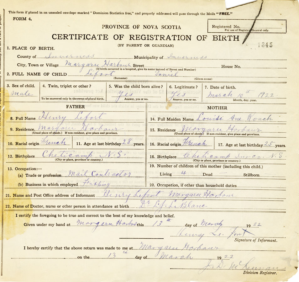 21. Name and Post Office address of Informant Henry Le Fort Margaree Harbour