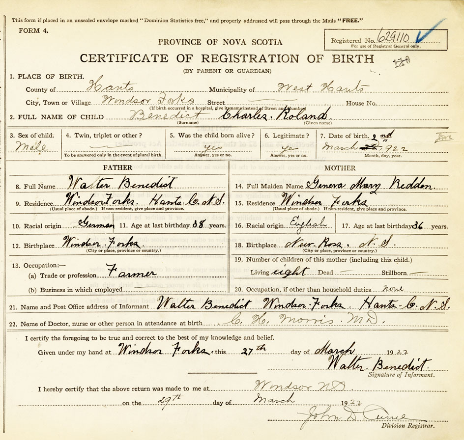 Male Birth Registration: Year: 1922 number: 62900110