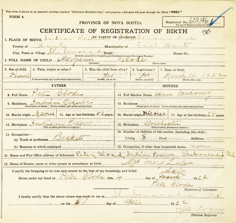21. Name and Post Office address of Informant Peter Gload Indian Reserve, Shubenacadie