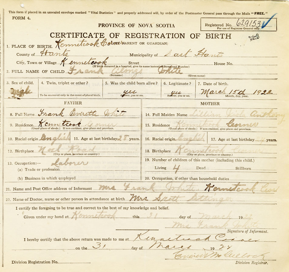 21. Name and Post Office address of Informant Mrs. Frank White Kennetcook Corner