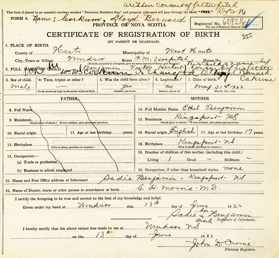 2. FULL NAME OF CHILD Corkum, Lloyd Bernard