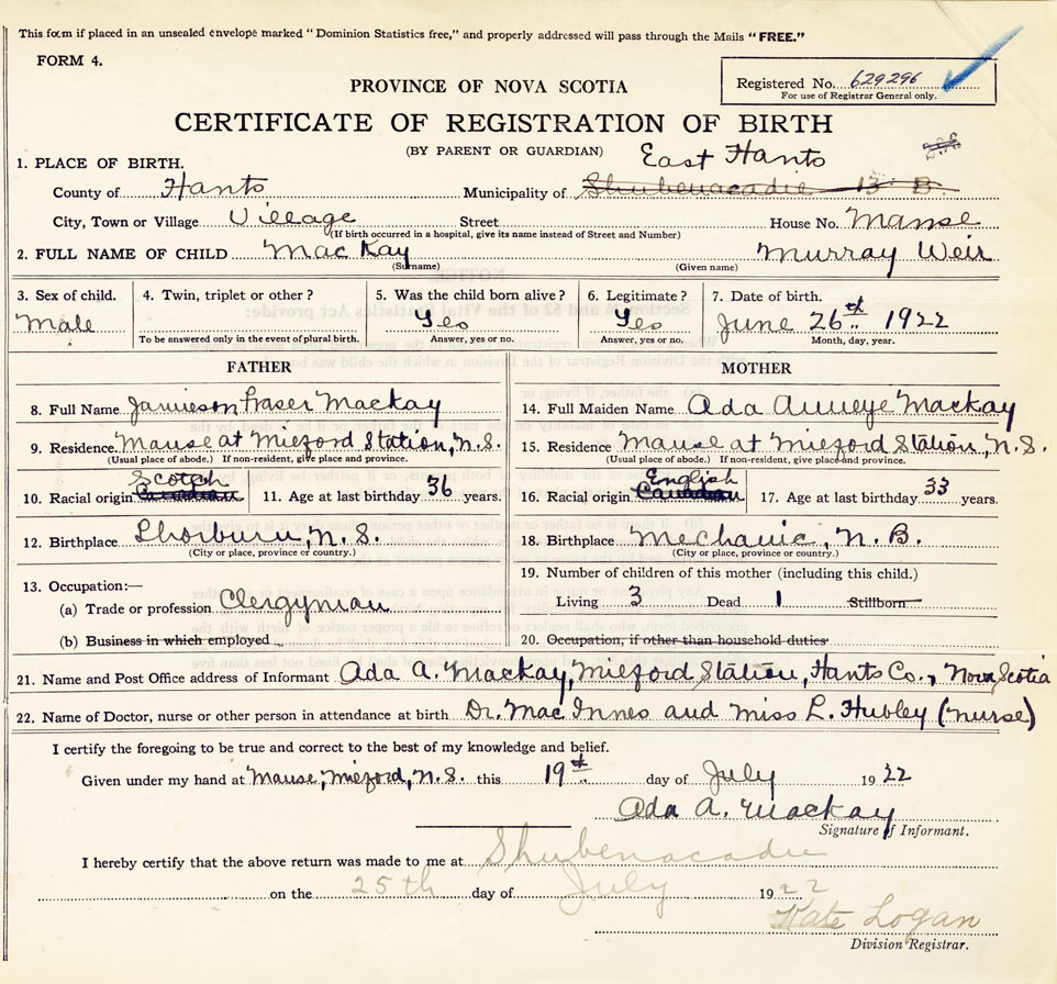 22. Name of Doctor, nurse or other person in attendance at birth Dr. MacInnis and Miss L. Hubley (nurse)