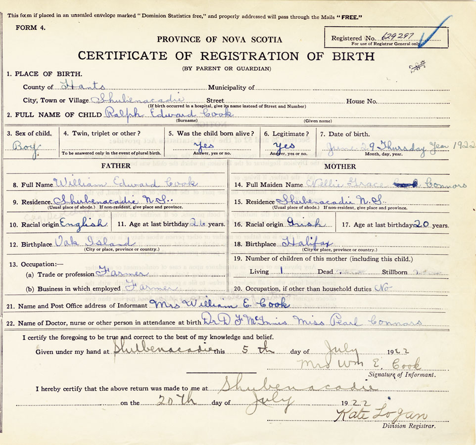 21. Name and Post Office address of Informant Mrs. William E. Cook Shubenacadie