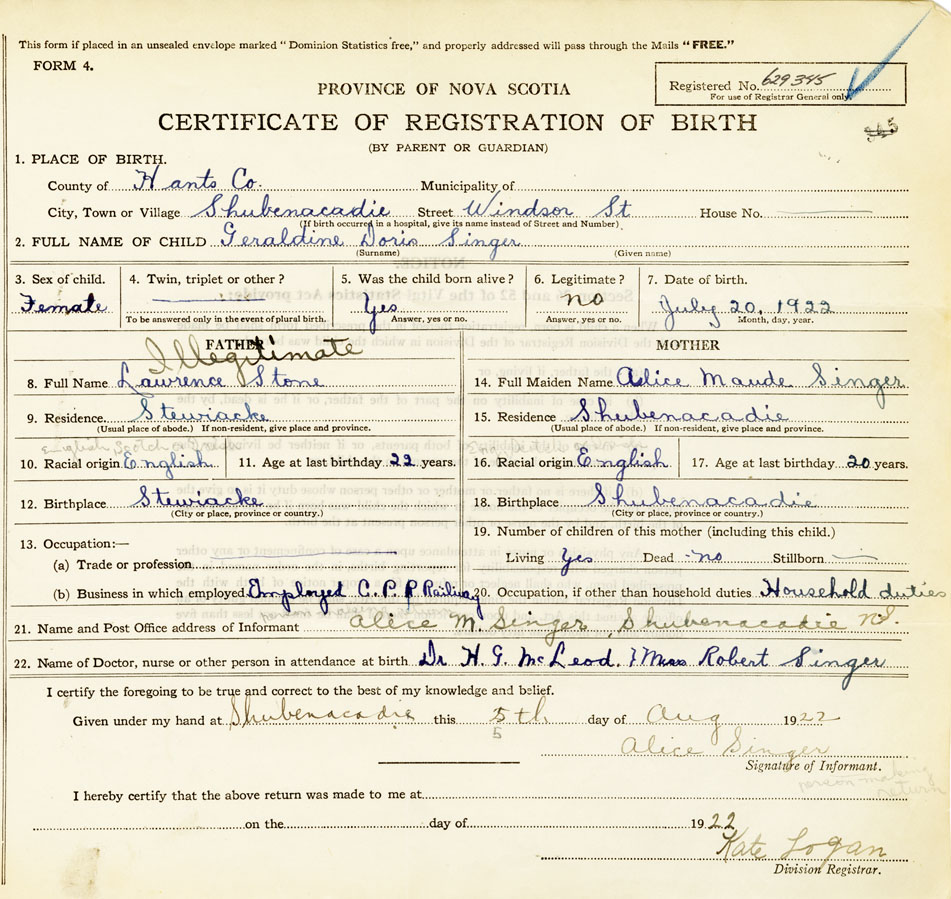 22. Name of Doctor, nurse or other person in attendance at birth Dr. H.G. McLeod Mrs. Robert Singer