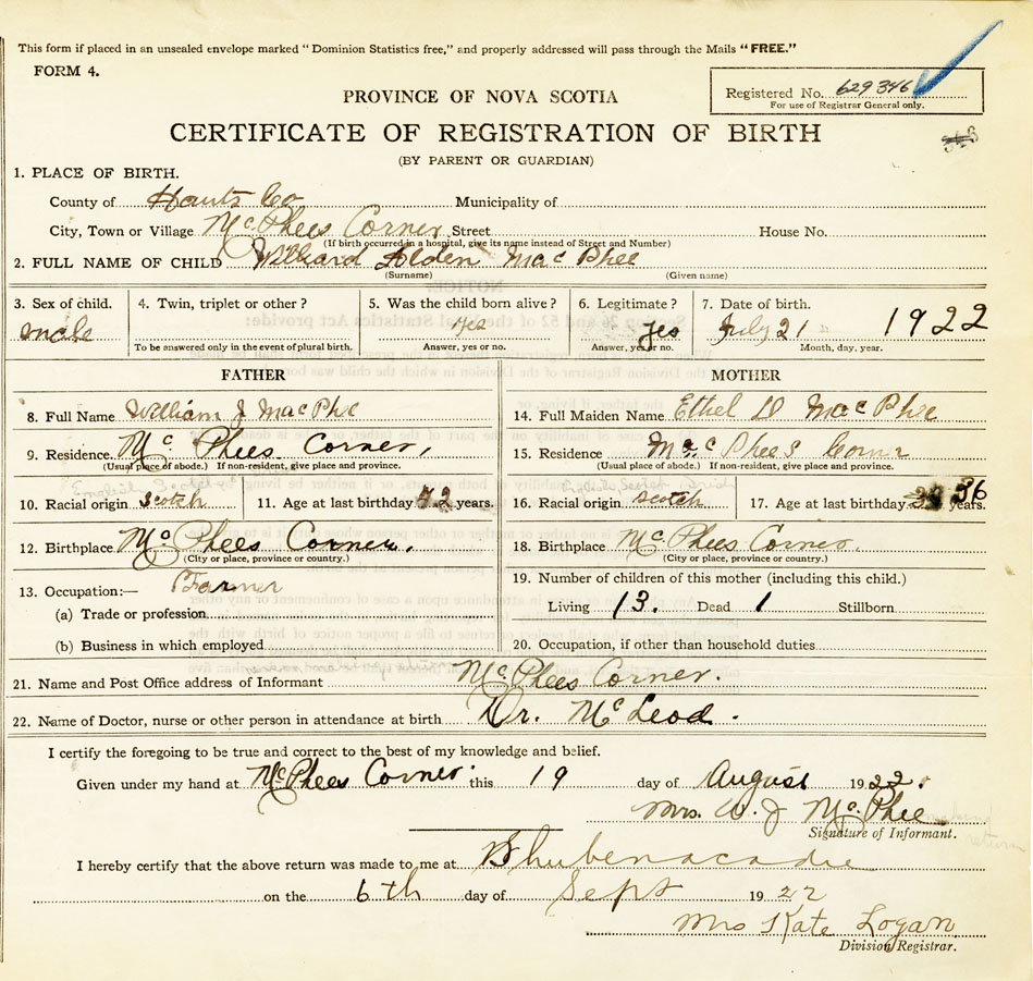 22. Name of Doctor, nurse or other person in attendance at birth Dr. MacLeod