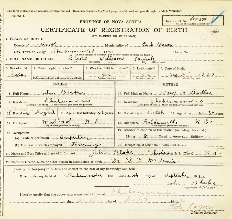 21. Name and Post Office address of Informant John Blake Shubenacadie