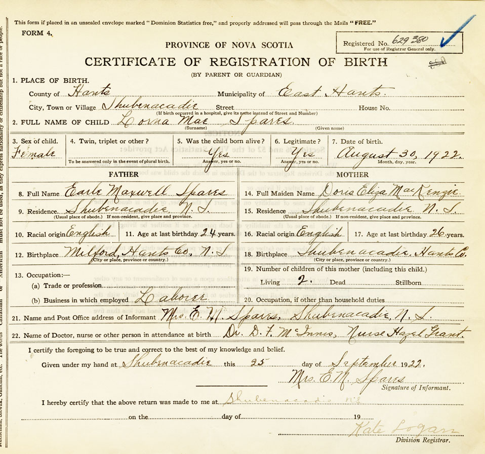 21. Name and Post Office address of Informant Mrs. E.M. Spares Shubenacadie