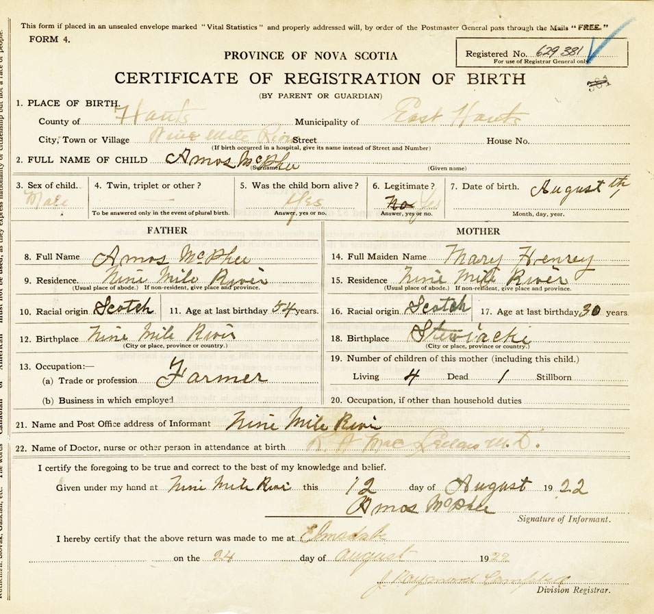 21. Name and Post Office address of Informant Amos McPhee Nine Mile River