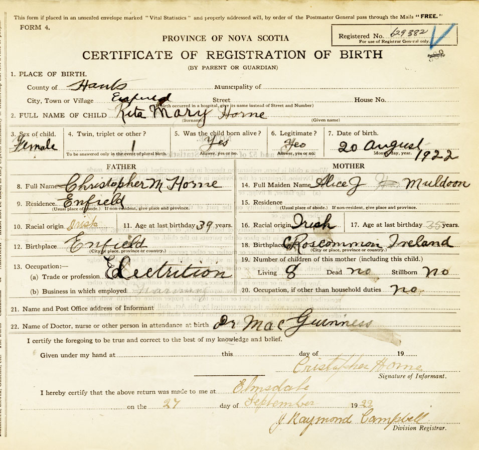 22. Name of Doctor, nurse or other person in attendance at birth Dr. MacGuinness