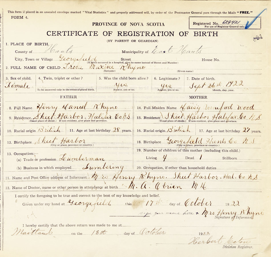 21. Name and Post Office address of Informant Mrs. Henry Rhyno Sheet Harbour