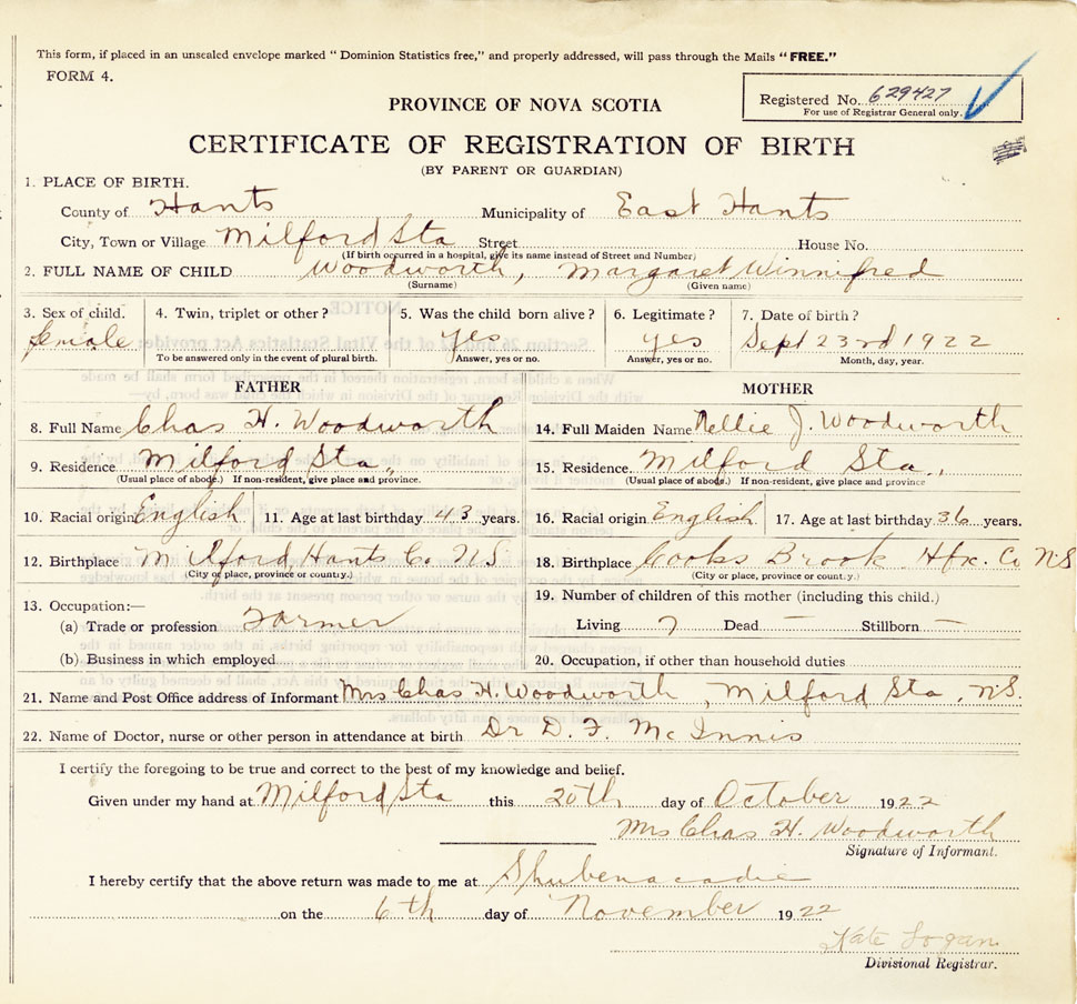 Female Birth Registration: Year: 1922 number: 62900427