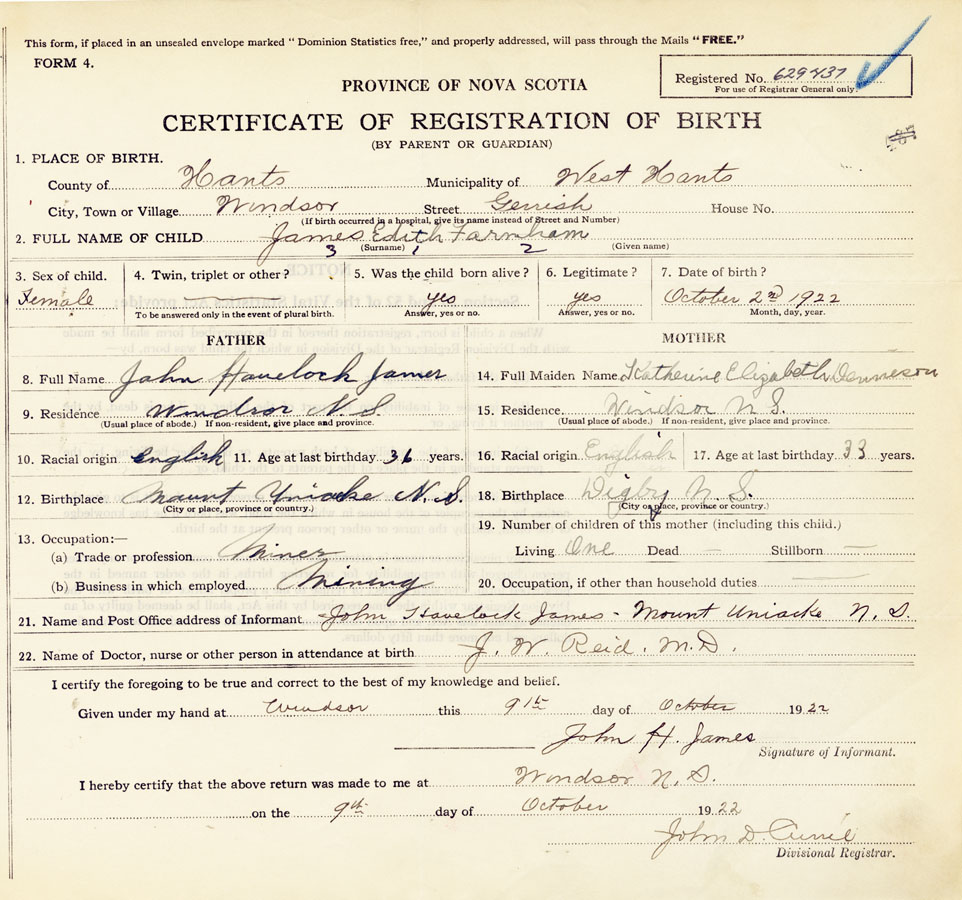 21. Name and Post Office address of Informant John Havelock James Mount Uniacke