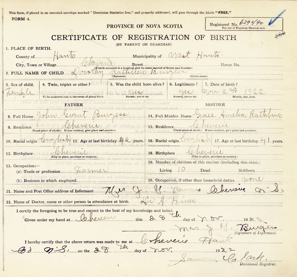 21. Name and Post Office address of Informant Mrs. J.G. Burgess Cheverie