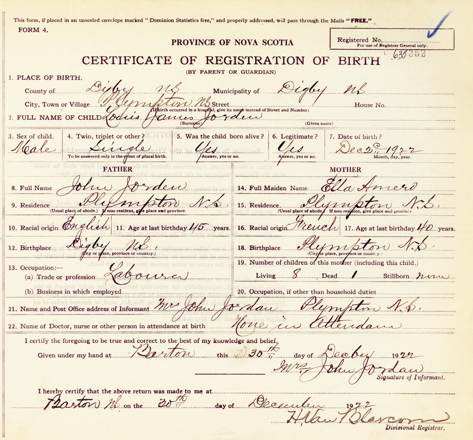 21. Name and Post Office address of Informant Mrs. John Jordan Plympton N.S.