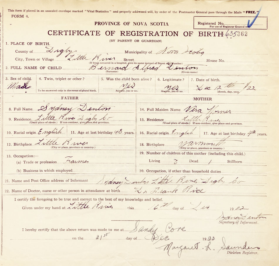 21. Name and Post Office address of Informant Sydney Denton Little River, Digby Co