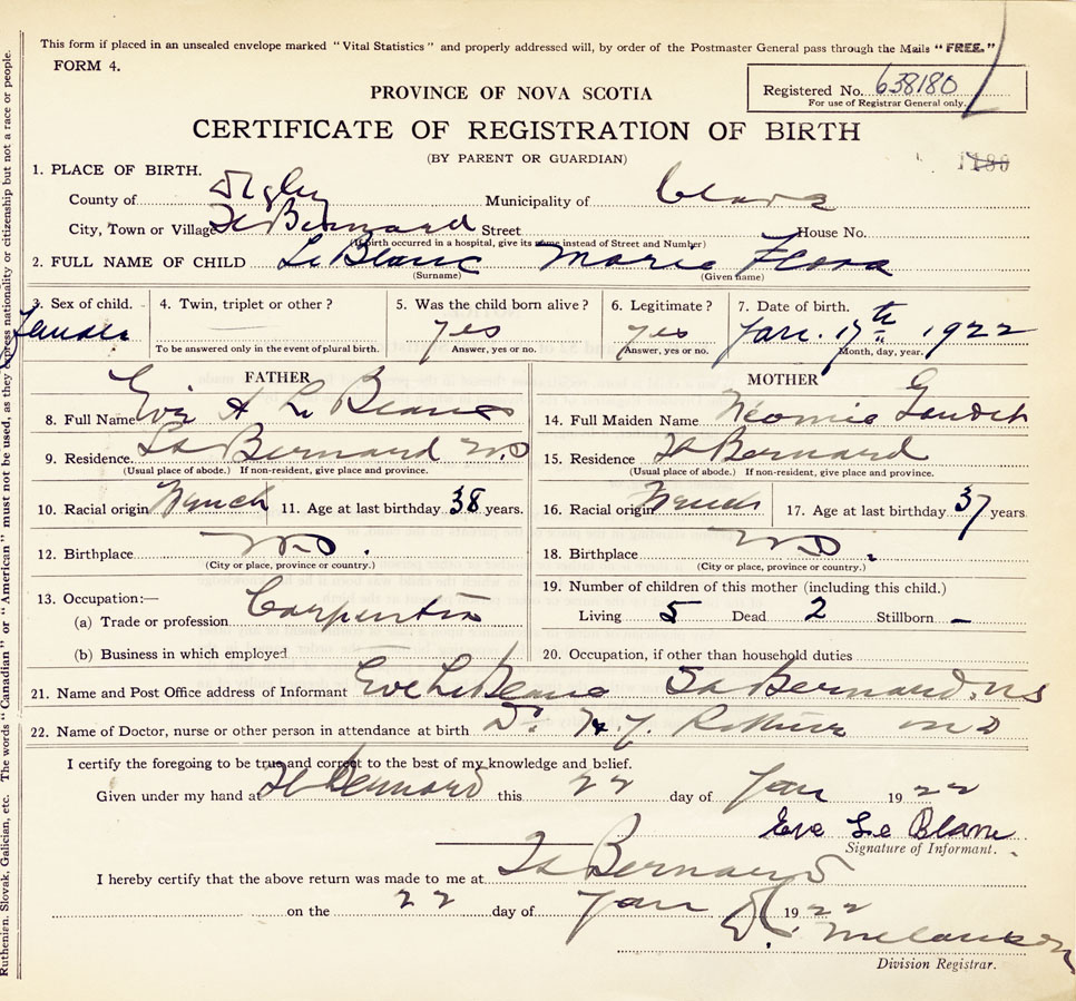 2. FULL NAME OF CHILD LeBlanc, Marie Flora