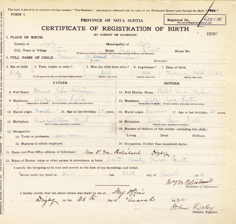 21. Name and Post Office address of Informant Mrs V M Robichaud Digby