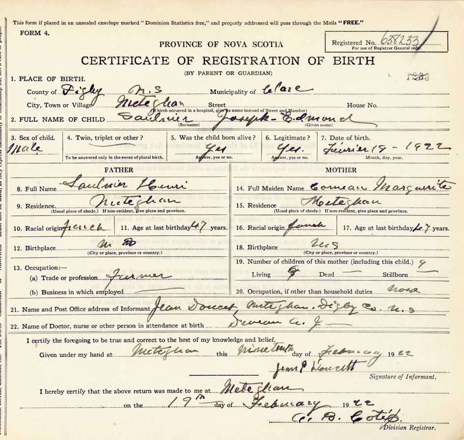 21. Name and Post Office address of Informant Jean Doucet Meteghan, Digby Co