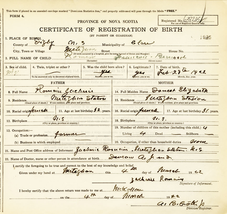 21. Name and Post Office address of Informant Zacharie Romain Meteghan Station