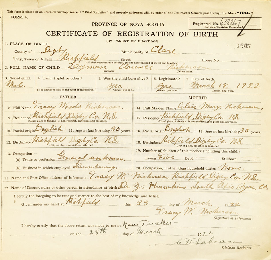 21. Name and Post Office address of Informant Tracy W Nickerson Richfield, Digby Co