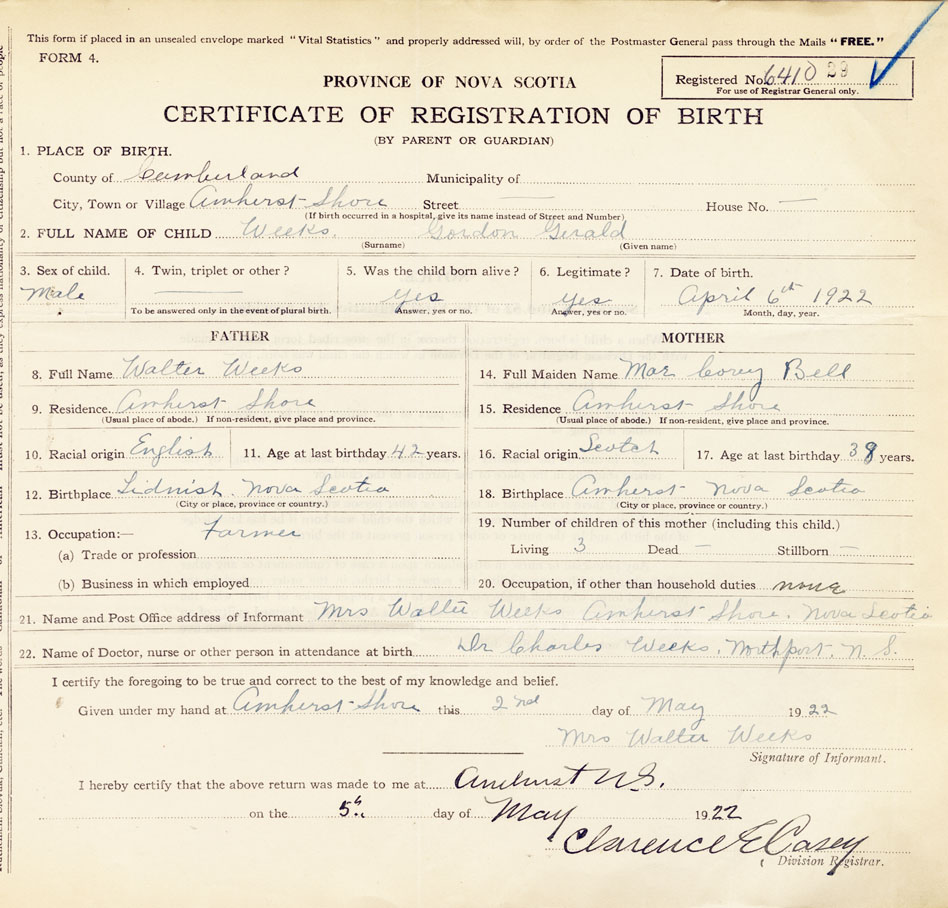 21. Name and Post Office address of Informant Mrs Walter Weeks Amherst Shore