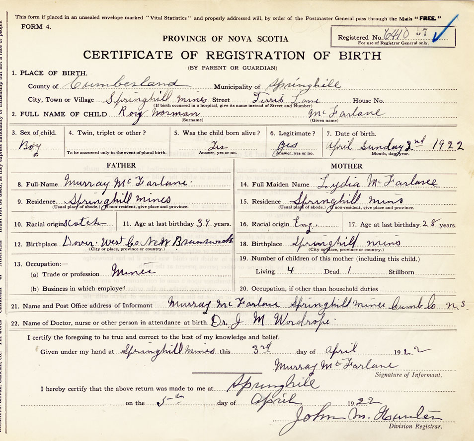 21. Name and Post Office address of Informant Murray McFarlane Springhill Mines, Cumb.