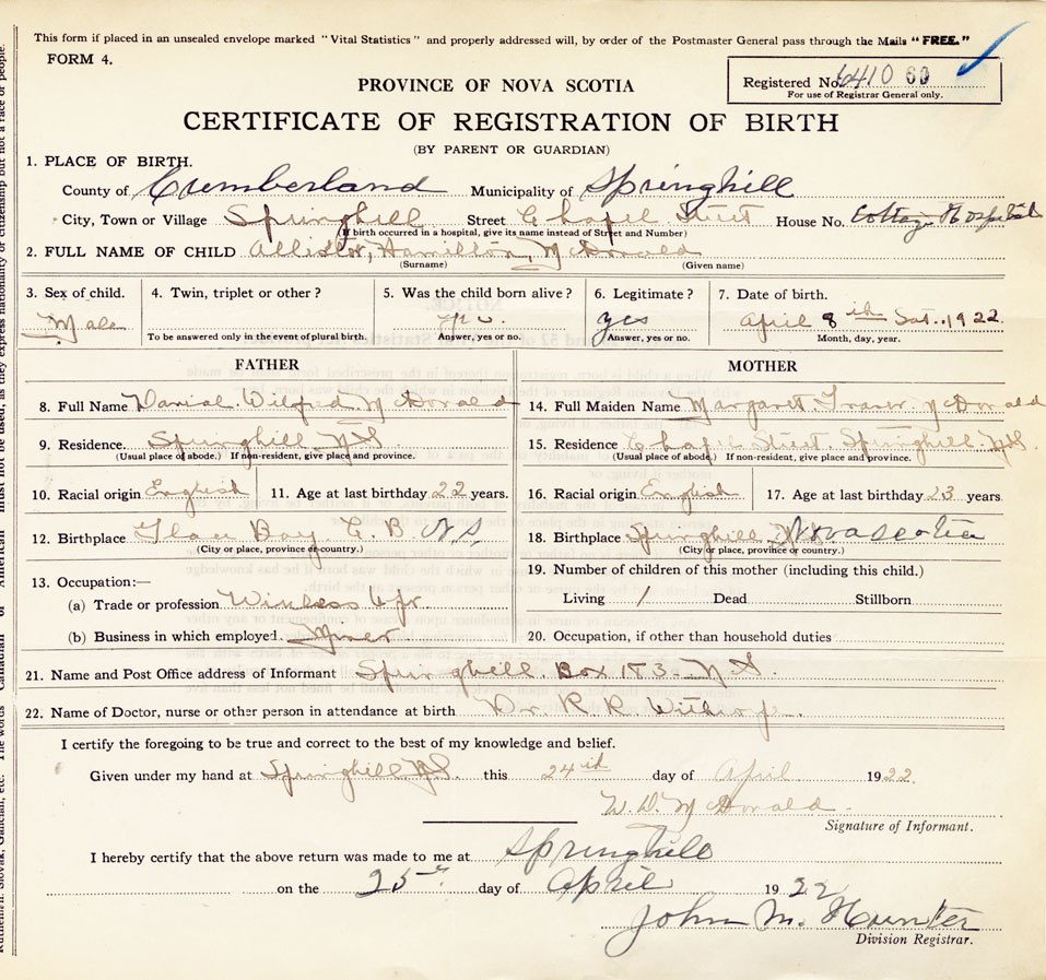 21. Name and Post Office address of Informant W. D. McDonald Springhill, Box 183, N.S.