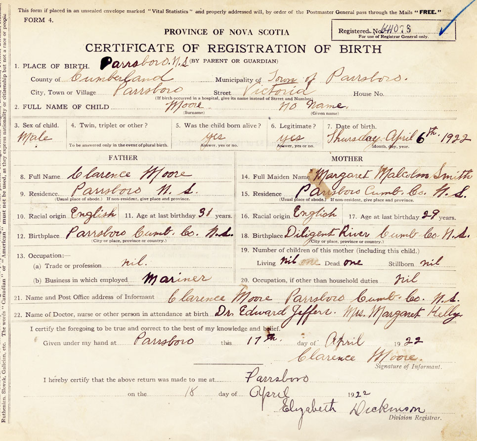 21. Name and Post Office address of Informant Clarence Moore Parrsboro, Cumb.