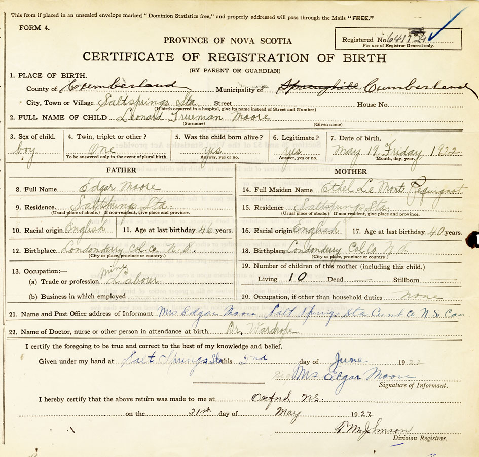 21. Name and Post Office address of Informant Mrs Edgar Moore Saltsprings, Cumb. Nova Scotia, Canada