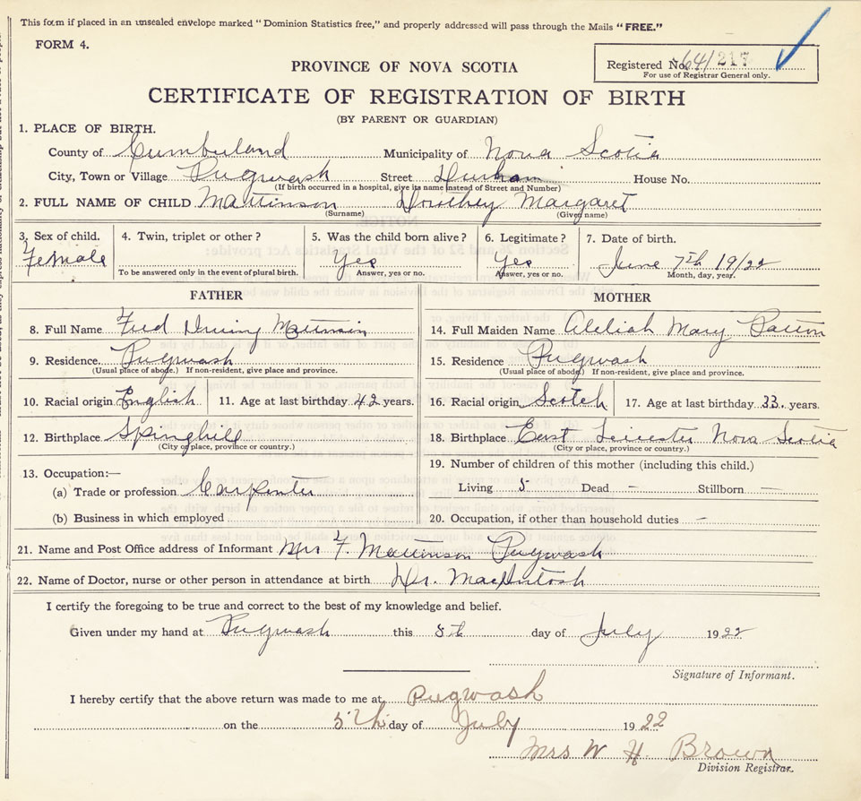 21. Name and Post Office address of Informant Mrs. F Mattinsen Pugwash