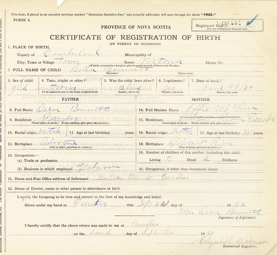 21. Name and Post Office address of Informant Mrs. Oscar Bennett Parrsboro